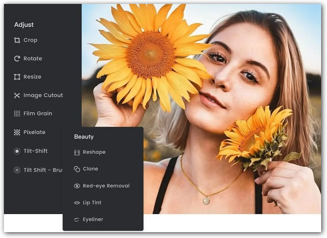 Бесплатный онлайн-редактор, с помощью которого можно обрезать изображения, изменять их размер, добавлять текст, создавать коллажи и элементы дизайна.